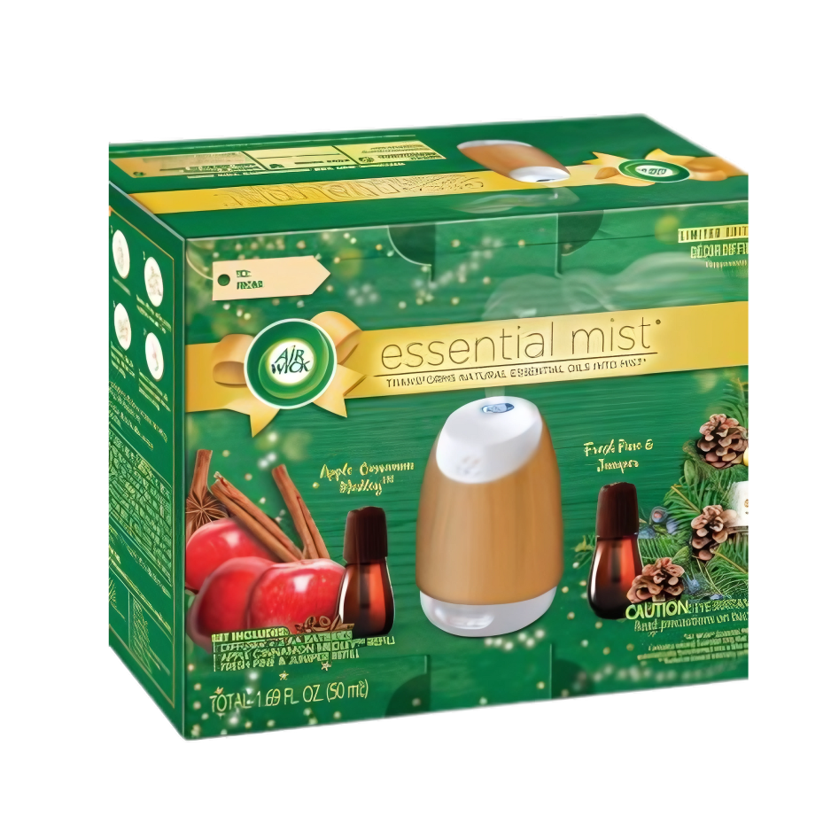 Details: Discover the more natural and premium fragrance infused with natural essential oils diffused by mist with Air Wick Essential mist diffuser. It transforms fragrance infused with natural essential oils into a gentle mist that surrounds your home. Several premium fragrances available in refills: Lavender and almond blossom, fresh water breeze, mandarin and sweet tangerine, coconut and pineapple, Peony and jasmine, sandalwood, fresh cucumber, eucalyptus, sweet Melon and Vanilla; seasonal scents like apple Cinnamon medley, pumpkin Spice, sweet fruit and nutmeg, brown sugar and vanilla, fresh pine and juniper and, our Aroma range with happiness, sleep and unwind.