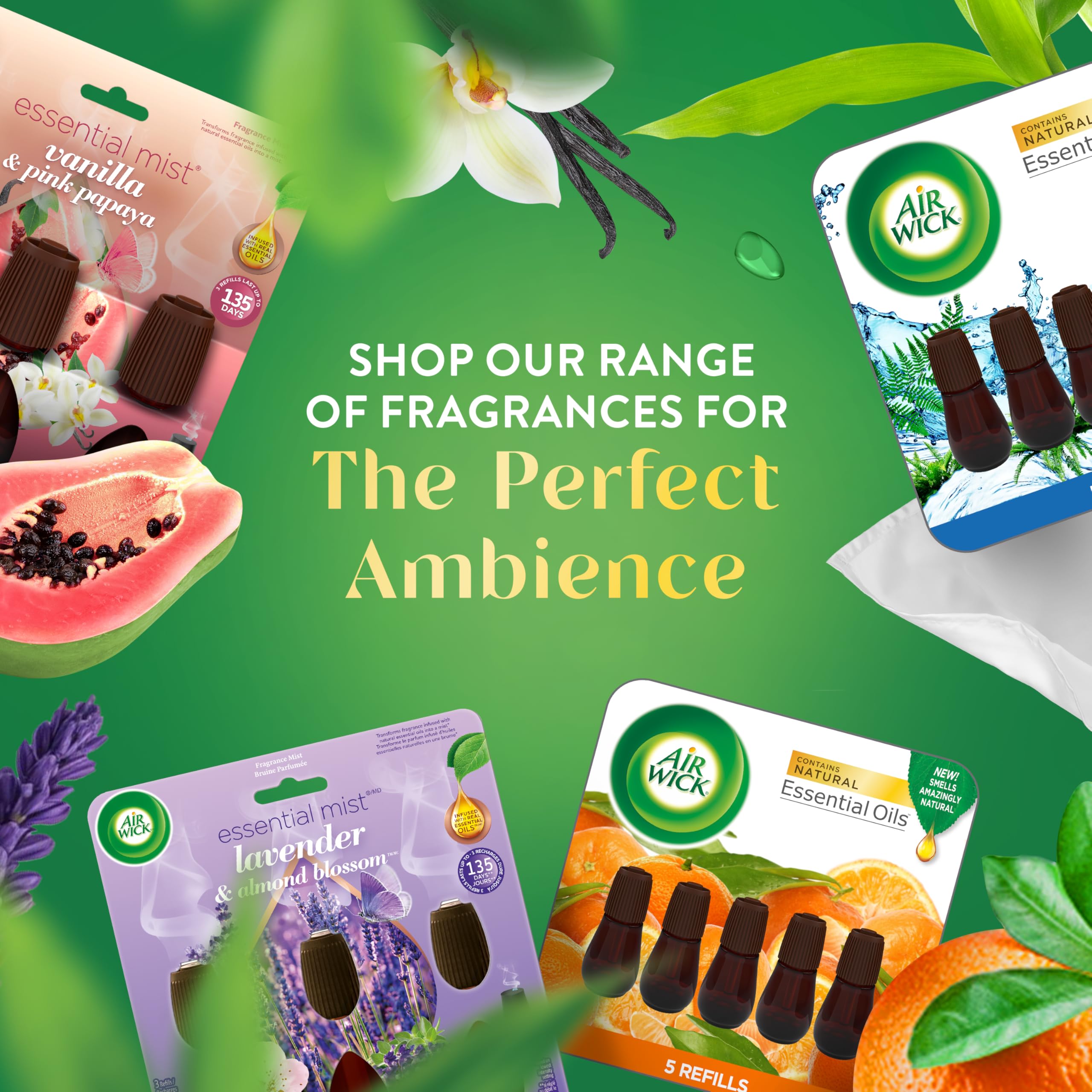 Details: Discover the more natural and premium fragrance infused with natural essential oils diffused by mist with Air Wick Essential Mist diffuser. It transforms fragrance infused with natural essential oils into a gentle mist that surrounds your home. Several premium fragrances available in refills: Lavender and Almond Blossom, Mandarin and Sweet Tangerine, Coconut and Pineapple, Peony and Jasmine, Sandalwood, Sweet Melon and Vanilla; seasonal scents like Apple Cinnamon Medley, Pumpkin Spice, Sweet Fruit and Nutmeg, Brown Sugar and Vanilla, Fresh Pine and Juniper and, our Aroma range with Happiness, Sleep, Unwind and Rejuvenate.