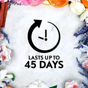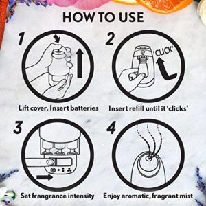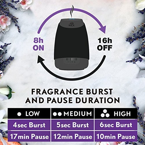 Details: Air Freshener Dispenser and Refill, Continuous, Black, Cleaner Chemical Product Grouping Air Freshener Dispenser with Refill, Essential Mist, Dispenser Mounting Surface, Refill Type Bottle, Coverage 2,000 cu ft, Scent Release Settings Continuous, Dispensing Method Diffuser, Dispenser Includes Dispenser/Refill Combos, Fragrance Lavender & Almond Blossom, Refill Life 45 day, Battery, Includes Batteries Yes, Battery Size AA, Height 7 in, Width 7 3/4 in, Includes Diffuser, Refill
