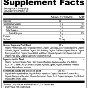 Healthy Gut: Supports healthy digestive function, detoxification, healthy energy, reduces occasional gas & bloating, and helps maintain healthy gut microflora with chlorella, spirulina, elderberry, ginger, and full servings of fruits and vegetables