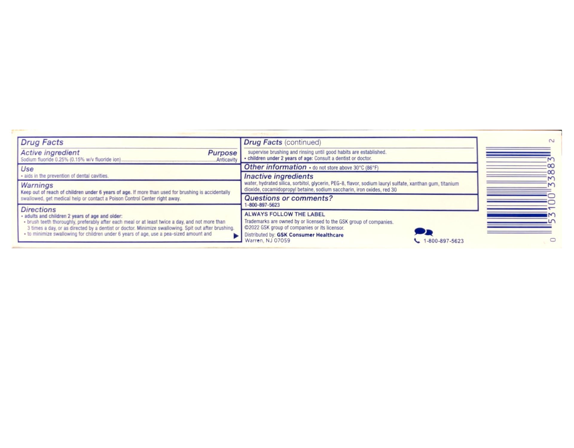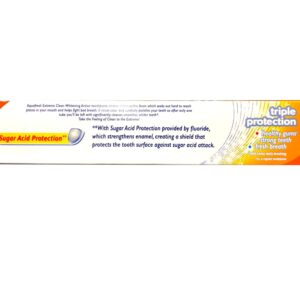 Details: Whole mouth protection. Purpose: Toothpaste. Manufacturer: Glaxosmthkln. Active Ingredients: Sodium Fluoride 0.15 % (w/v of fluoride ion). Directions: Adults and children 2 years and older: Apply toothpaste onto a soft bristle toothbrush. Brush thoroughly after meals or at least twice a day or use as directed by a dentist or physician. To minimize swallowing for children under 6, use a pea-sized amount and supervise brushing until good habits are established. Children under 2 years ask a dentist or physician. Store below 30 degrees C (86 degrees F). Inactive Ingredients: Cocamidopropyl Betaine; D&C Red #30; Flavor; Glycerin; Hydrated Silica; PEG-8; Sodium Lauryl Sulfate; Sodium Saccharin; Sorbitol; Synthetic Iron Oxide; Titanium Dioxide; Water; Xanthan Gum. Uses: Aids in the prevention of dental cavities. Triple Protection: Healthy Gums, Strong Teeth, Fresh Breath. Dynamic micro-active foam showers your whole mouth with germ killing bubbles. Helps to protect teeth with fluoride and maintain healthy gums with regular brushing. Professionally developed micro polishing system carefully polishes teeth smooth. Teeth stay cleaner & whiter for longer*. Seeks out hard to reach places – in between teeth & even the back of your tongue – fighting the source of bad breath. Rinses clean and clear, leaving polished, clean, white teeth. Invigorating mint flavor leaves an icy cool, sparkling feeling long after you brush. *Scientific testing shows that after only one tube you’ll be left with significantly cleaner, smoother teeth than with a regular toothpaste!. Warnings: When using this product, if irritation occurs discontinue use. Keep out of reach of children under 6 years of age. If you accidentally swallow more than used for brushing, get medical help or contact a Poison Control Center right away.