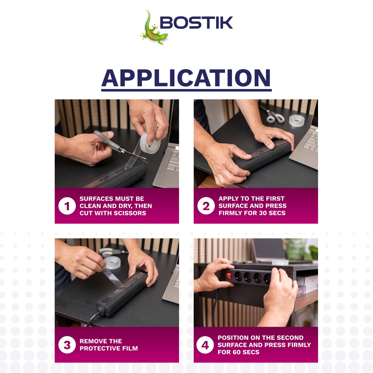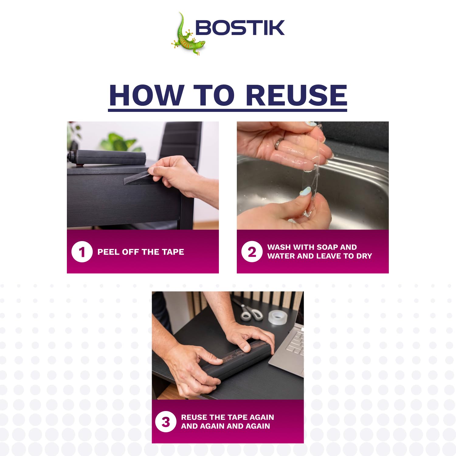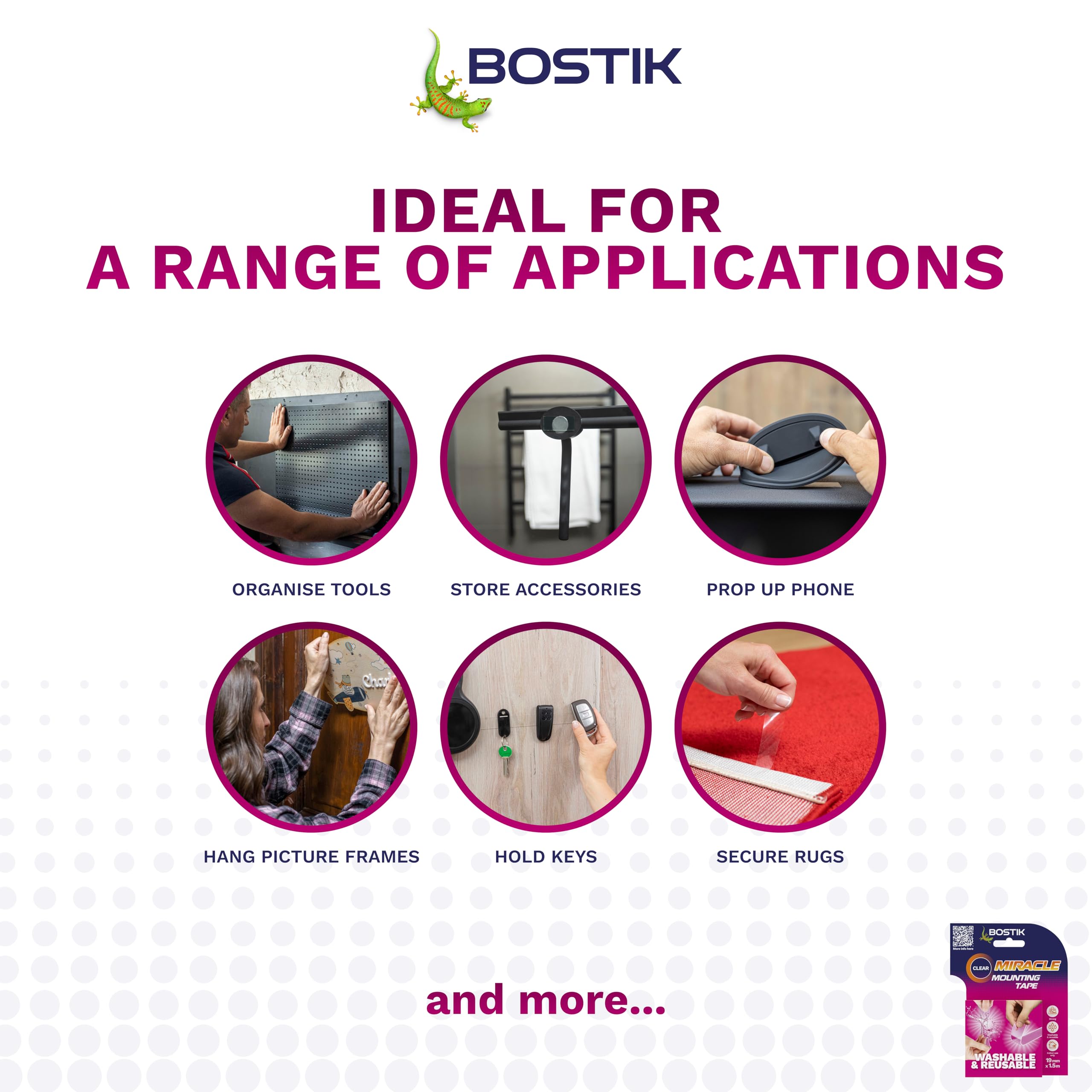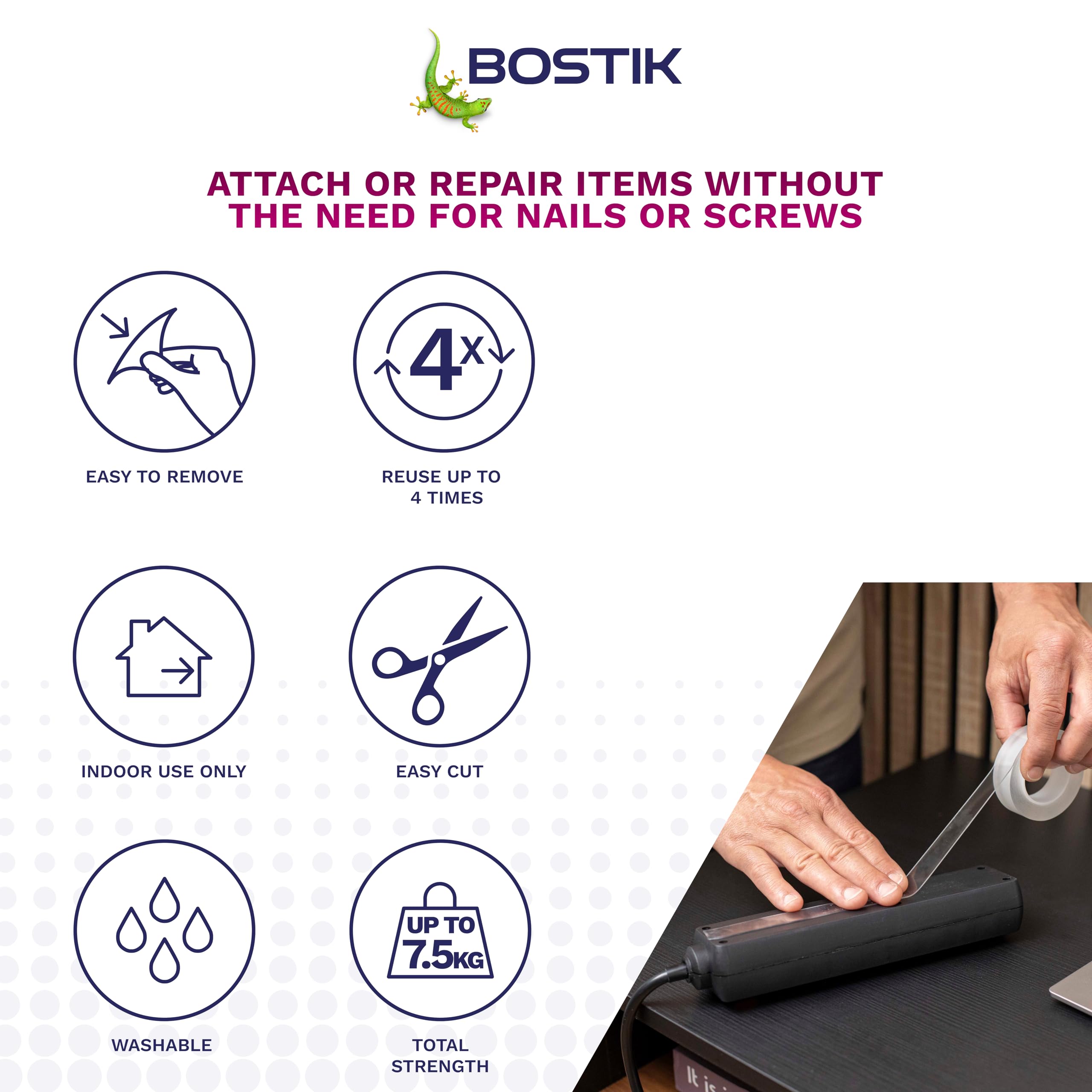 Details: Bostik Reusable Mounting Tape is a strong, double-sided clear mounting tape for use indoors. It’s perfect for transforming your home decor, offering unparalleled strength and versatility when hanging picture frames and other decorations to secure them in place.Its clever adhesive technology is washable under water, meaning you can reuse it again and again, plus it removes cleanly, leaving no sticky residue behind.This reusable mounting tape adheres to most materials including glass, wood, metal, ceramic and plastics* and supports up to 7.5kg, making it perfect for heavy items!Whether you’re looking for a picture mounting tape, a no-nail solution to fixing shelves, mirrors, or lights, or even a clear, double-sided tape to help with building and repairing household items, Reusable Mounting Tape is perfect for all. Being transparent, you get an undetectable bond that’s reliable, hassle-free and blends seamlessly with your decor, while providing the heavy-duty support you need. For a strong, double-sided mounting tape that you can trust, look no further than Bostik Reusable Mounting Tape!*except PP and Teflon
