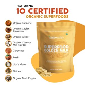 10 Superfoods for a Synergistic Health Boost: Featuring 10 certified organic superfoods, including turmeric, organic coconut milk powder, ginger, Ceylon cinnamon, black pepper, Himalayan pink salt, monk fruit, shiitake, lion’s mane, reishi, and cordyceps. Paleovalley Superfood Golden Milk delivers a synergistic blend of nutrients. This combination aims to provide a wide range of benefits, from soothing inflammation to supporting a strong immune system to playing a role in cognitive function.